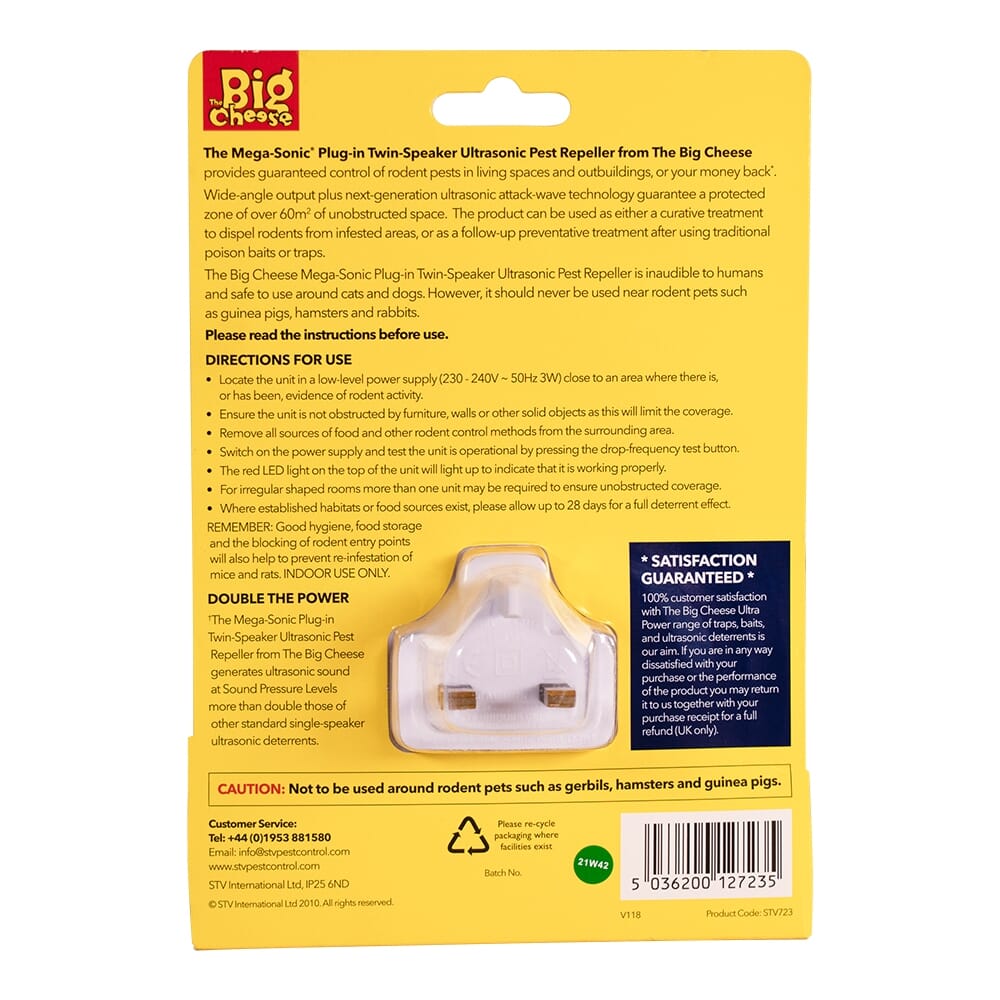 The Mega-Sonic® Plug-in Twin-Speaker Ultrasonic Pest Repeller from The Big Cheese® provides guaranteed control of rodent pests in living spaces and outbuildings, or your money back. Wide-angle output plus next-generation ultrasonic attack-wave technology guarantee a protected zone of over 60m² of unobstructed space. The product can be used as either a curative treatment to dispel rodents from infested areas, or as a follow-up preventative treatment after using traditional poison baits or traps. The Big Cheese Mega-Sonic Plug-in Twin-Speaker Ultrasonic Pest Repeller is inaudible to humans and safe to use around cats and dogs. However, it should never be used near rodent pets such as guinea pigs, hamsters and rabbits. 24/7 protection: poison-free rodent control for the home. Twin-speaker, cable-free unit.